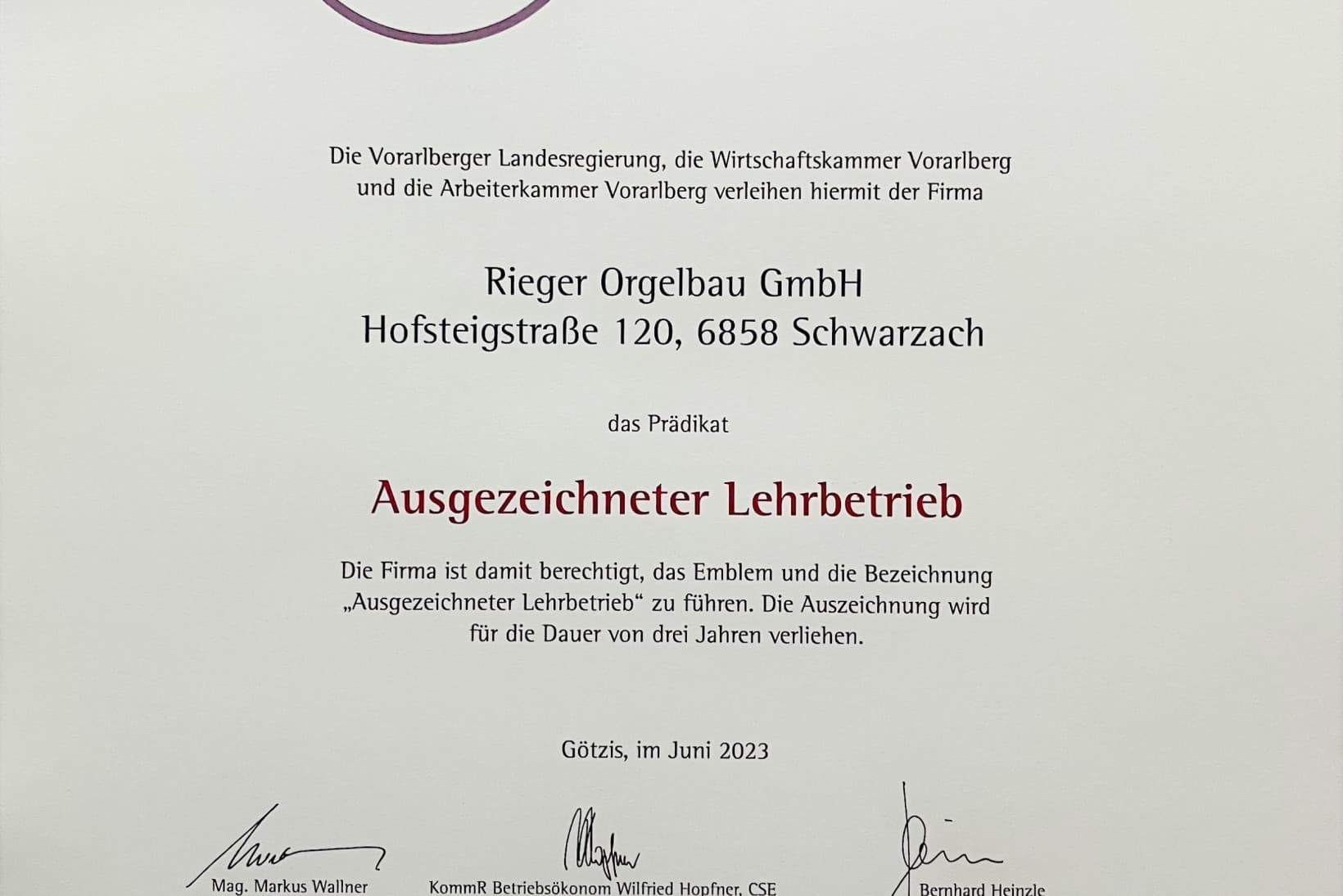 Die Vorarlberger Landesregierung, die Wirtschaftskammer Vorarlberg und die Arbeiterkammer Vorarlberg haben der Firma Rieger Orgelbau erneut das Prädikat „Ausgezeichneter Lehrbetrieb“ verliehen, worauf wir sehr stolz sind und worüber wir uns sehr freuen.