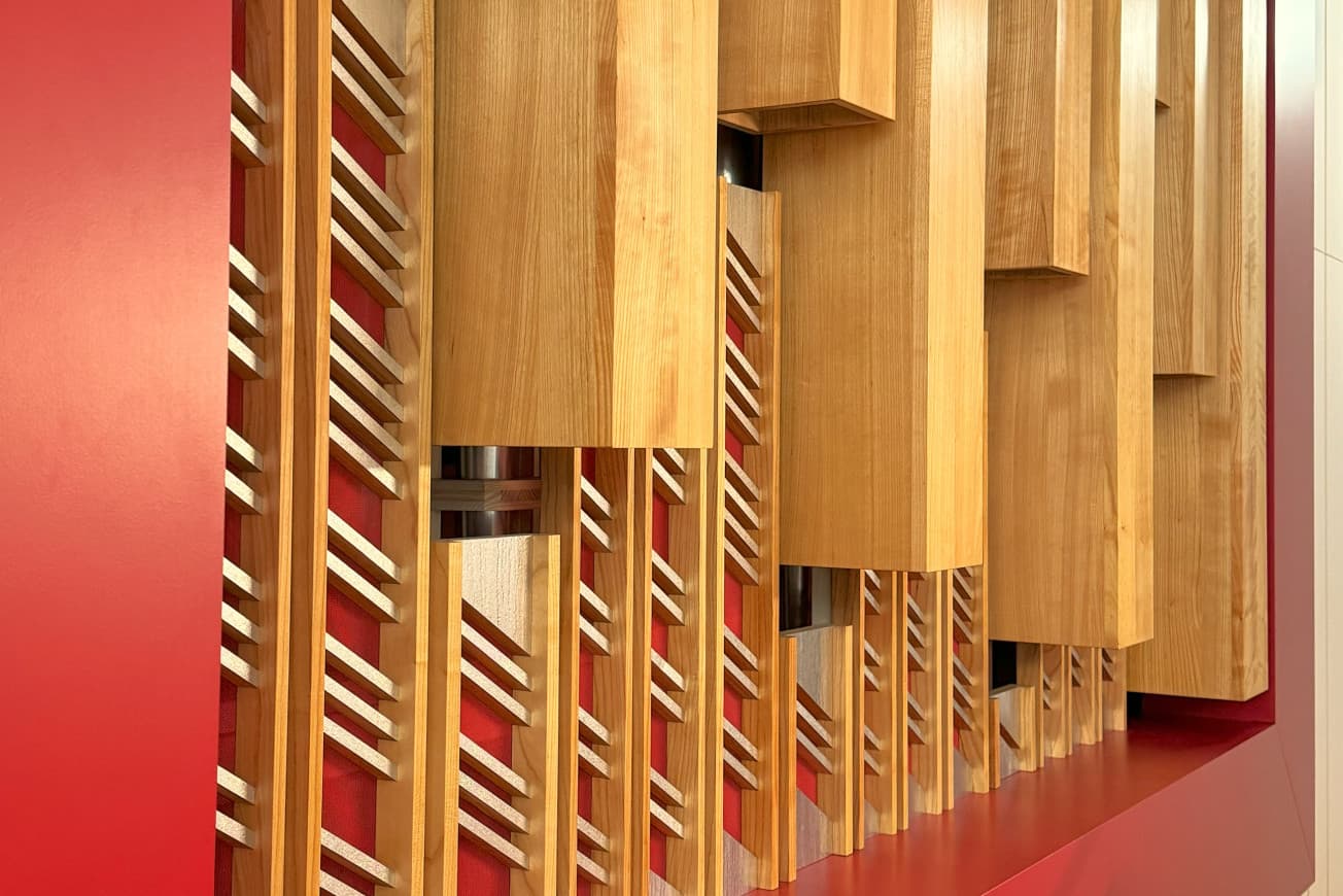 Auch die Gestaltung ist originell: Die prägende rote Lienie, welche links die Orgel verlässt, zieht sich über Boden und Wände durch den ganzen Raum und kehrt rechts in den Prospekt zurück.